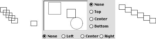Distribute is enabled only when three or more objects are selected. The Distribute option distributes the objects evenly within the space they occupy. Vertical distribution distributes the objects evenly between the top-most and bottom-most objects. Horizontal distribution distributes the objects evenly between left-most and right-most objects. The horizontal and vertical placement of each object is determined independently. The placement of each object is also determined by the horizontal (none, left, right and center) and vertical settings (none, top, center and bottom). Thus, if the horizontal setting is left and the vertical setting is center, the objects will be distributed based on the center of their left side. After you have established your distribution method, click on the Do It button.