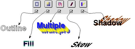 Use these buttons to load and control the five effects inspectors. Click on the bottom small checkboxes to apply that effect to a selected object. Clicking on the larger top button (with the icon) will load the desired inspector, but will not activate it.